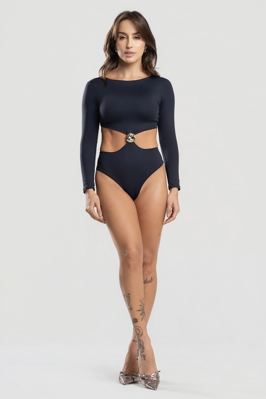 O Body Five: é a escolha ideal para quem procura um visual contemporâneo e marcante. Com design frontal clean e detalhe central em argola metálica, o modelo valoriza a cintura com um recorte moderno que alia sensualidade e sofisticação na medida certa. As mangas longas proporcionam equilíbrio ao look, enquanto o corte justo ao corpo garante conforto e caimento impecável.